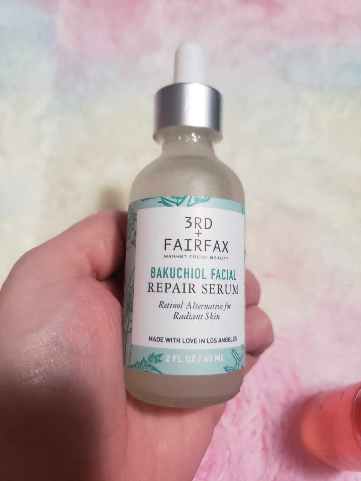 I am in my late 40's with dry, sensitive skin. I like to use retinol in the evening and have started using bakuchiol in the morning.This arrived in a frosted glass bottle with a dropper. The bottle is plastic sealed so you will know it has not been tampered with. The dropper works well to dispense a single drop or more if needed. The serum is a milky white with a gel consistency. It smooths into my skin easily without any rubbing or tugging and has a very faint citrus almost lemon scent that I like. It doesn't leave my skin shiny or sticky.This works well for my sensitive skin. I had no redness, itching, burning or peeling.